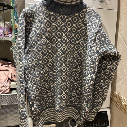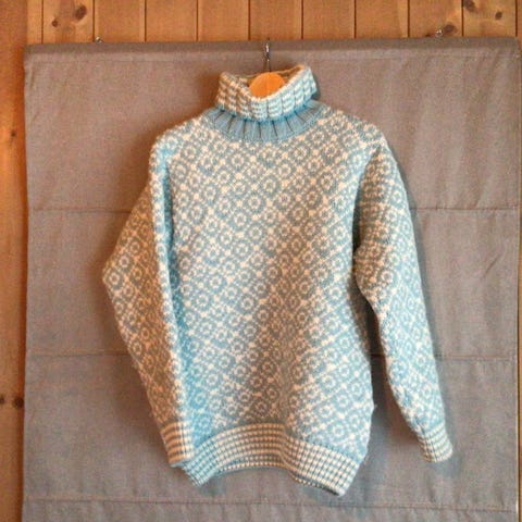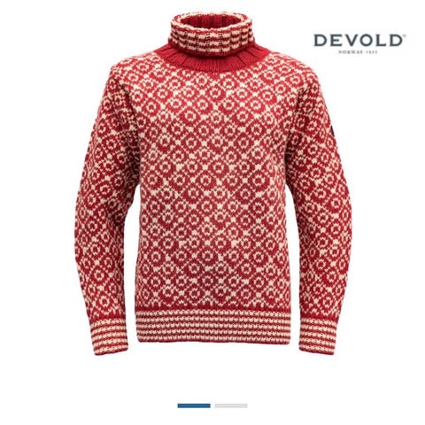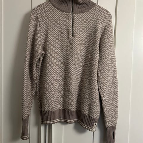 Devold høyhalset genser i størrelse M for dame. Genseren er hvit med mønster og laget av ull.