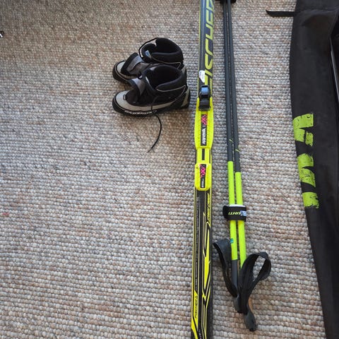 Ski 90 cm smørefrie sko str 27 og staver 70 cm.