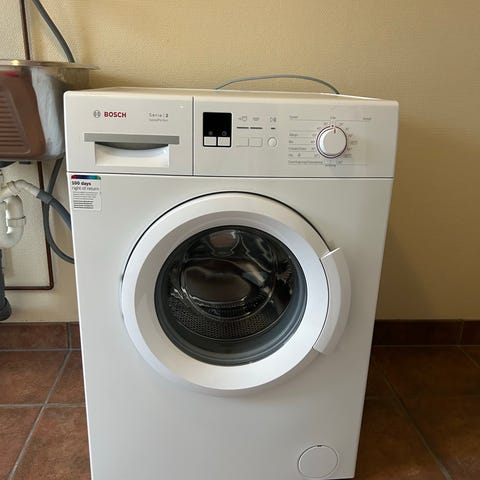 Bosch frontmatet vaskemaskin med standard hvit farge og frontmatet design. Maskinen har ulike vaskeprogrammer og kontrollpanel med knapper og dreiebryter for enkel betjening.Fuungerer veldig bra,kan helpe med levering