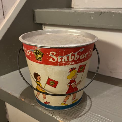 Nydelig, svært gammelt blikkspann, trolig brukt til sukker/te/kaffe