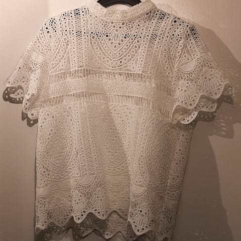 Selger denne asymmetriske blondetoppen med lange ermer.