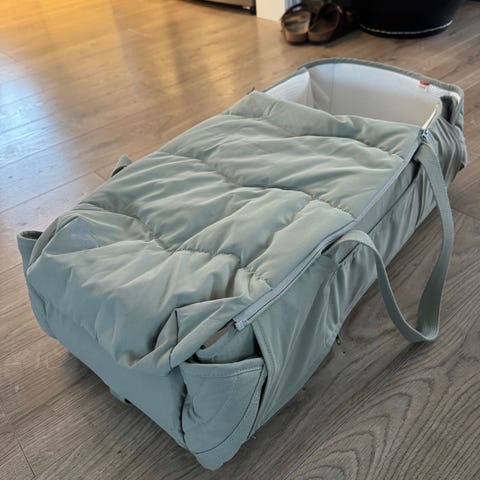 Selger Voksi Carry Me bærebag i fargen Beige/Seashell sand. Denne har vært helt genial for oss! Kjøpt ny, og brukt i ca seks måneder. Noen små flekker/bruksmerker, men fremstår som svært pent brukt. Madrassen er nyvasket.