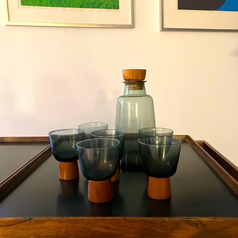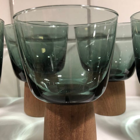 5 stk coctail glass med teak-stett fra 1960 Designet av Willy Johansson for Hadeland. Glassene er i god stand ingen sprekker eller skader. Selges for 400 pr stk. Kan sendes mottaker betaler porto på 69 kr med PostNord.