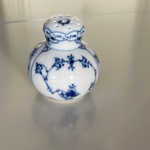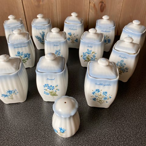 krydderibeholdere i keramikk med blå blomsterdekor. Settet inkluderer 4 store og 5 små.
