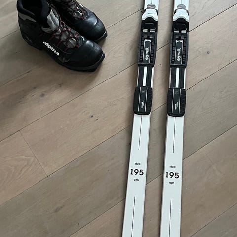 Montert med Rottefella-bindinger med røde spaker (NNN/Turnamic-kompatible – passer Salomon, Fischer, Alpina, Rossignol osv.).