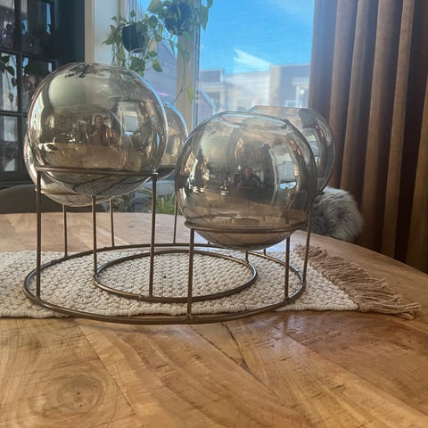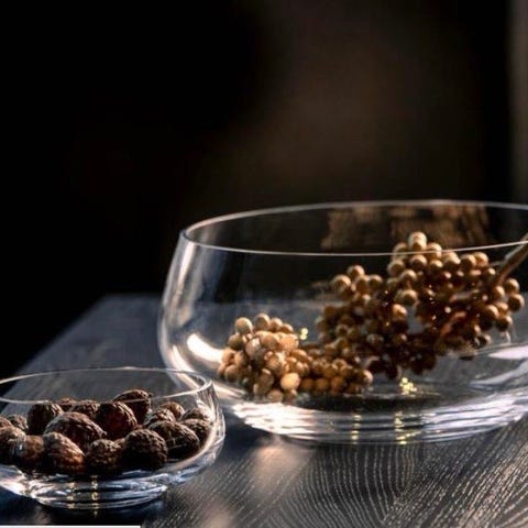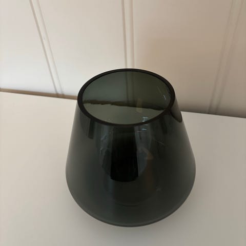 Magnor Glassverk dekorasjonsglass i mørkt glass. Produktet kan brukes som pynt eller til oppbevaring, og har et enkelt og stilrent design. Rocks serien til Halvor Bakke.