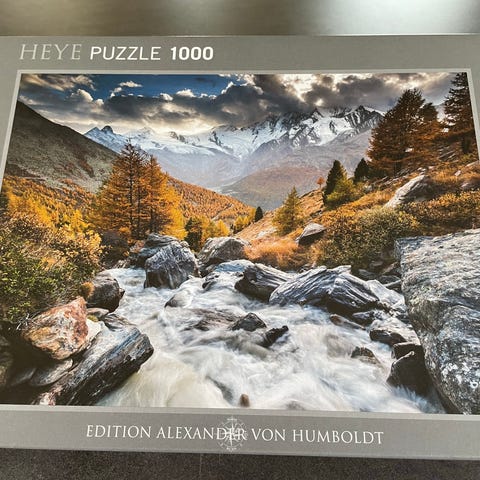 Hey! Puzzle 1000 brikker med landskap motiv. Puslespillet består av 1000 biter og viser et detaljert bilde av et naturlandskap med fjell og innsjø.