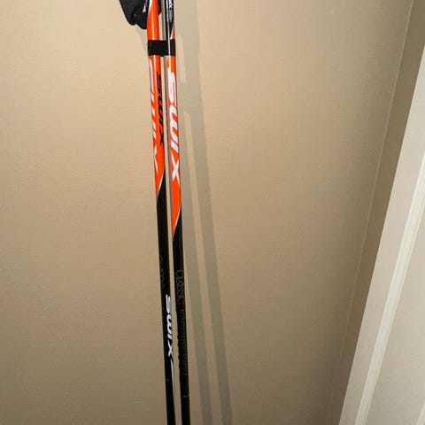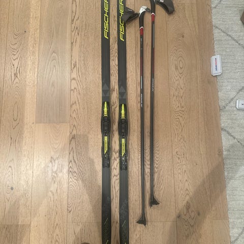 Fischer Universal langrennsski (smøre-/skøyteski) 157 cm med bindinger og Swix CT4 Composite staver 120 cm. Stavene ser meget bra ut, men skiene har sine bruksmerker.