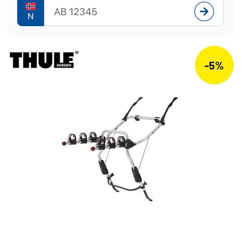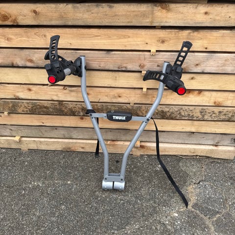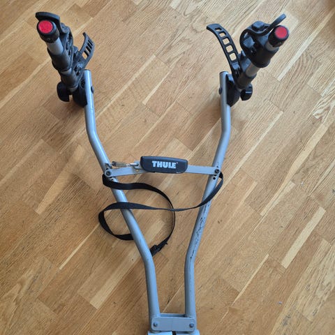 Thule sykkelstativ til bil med plass til to sykler. Laget i metall med festestropper for sikker montering. Passer til de fleste typer sykler og enkel å montere på tilhengerfeste.