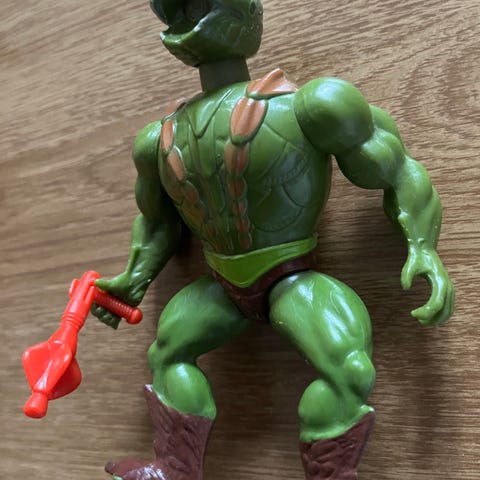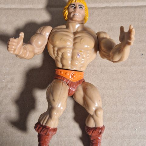 He-Man actionfigur med rød og sølv rustning, grønn bukse og svarte støvler. Figuren har detaljer som belte og armbånd. Laget av plast.