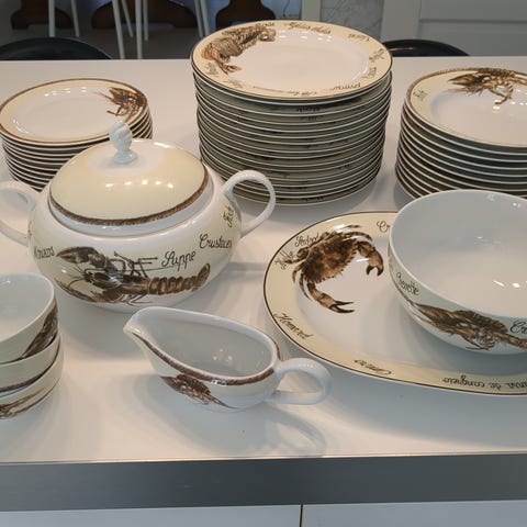 Sausenebb m/fat, 2 salatbolle/serveringsbolle, 2 Ovale fat, 12 middagstallerken 27 cm,12 tallerken dyp 24 cm, 1 suppeterrin, mye ikke brukt,kun noen tallerken.