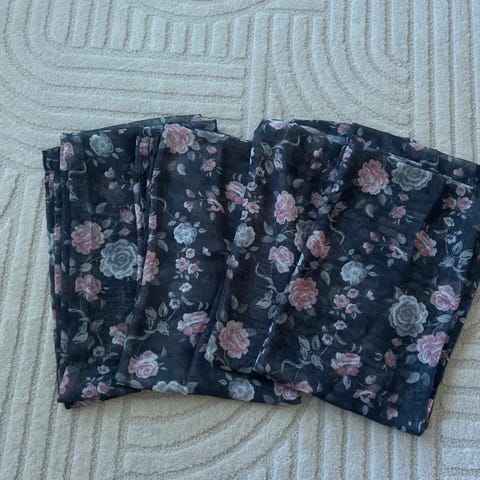2 stk i str 140x160 mørkerød gardiner med svarte maljer.