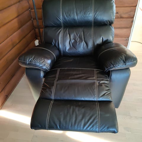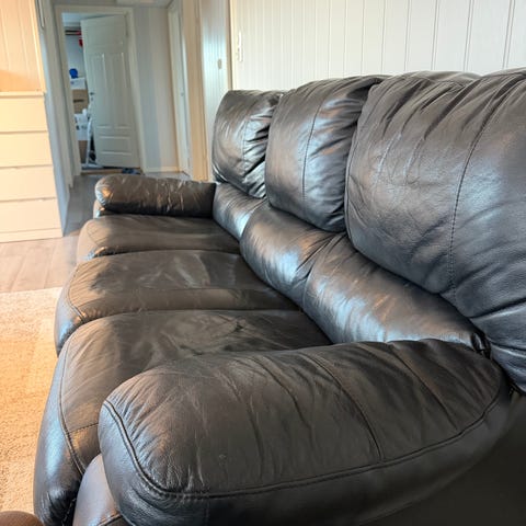 Gir bort 3 seter sofa i Svartskinn.er brukt men masse sofa igjen i de.gir også bort en slags lazyboy lenestol i svart skinn.godt brukt men fungerer fint.må hentes på fevik,grimstad