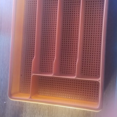 Oppbevaring til bestikk i grå hardplast, med 5 rom og noe bestikk, selges!