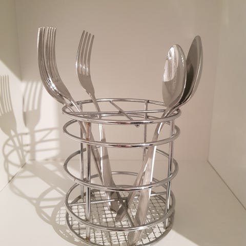 Oppbevaring til bestikk i grå hardplast med litt bestikk, selges, 250 kr + evt frakt. Noen skjeer i ulike størrelser og , en liten gaffel