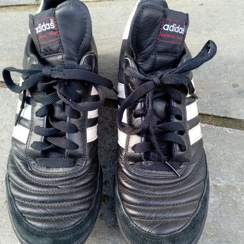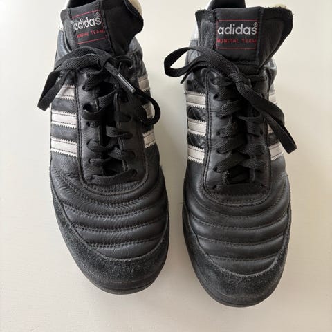 Adidas Copa Mundial fotballsko i svart med hvite detaljer. Skoene har knotter under sålen for bedre grep på kunstgress eller gressbaner. Designet for bruk på fotballbanen og laget med materialer som gir komfort og slitestyrke. Er ikke helt sikker på str men rundt 37, 38 eller 39.