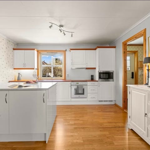 Hvitevarer som stekeovn, koketopp, vifte og oppvaskmaskin medfølger.