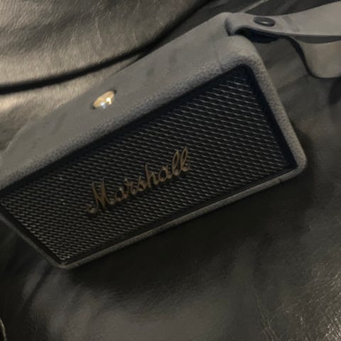 Marshall Bluetooth-høyttaler i svart farge. Utstyrt med kontrollknapper for volum, bass og diskant på toppen. Har bakside med tilkoblingsporter og informasjon om produktet. Designet for trådløs lydavspilling via Bluetooth.