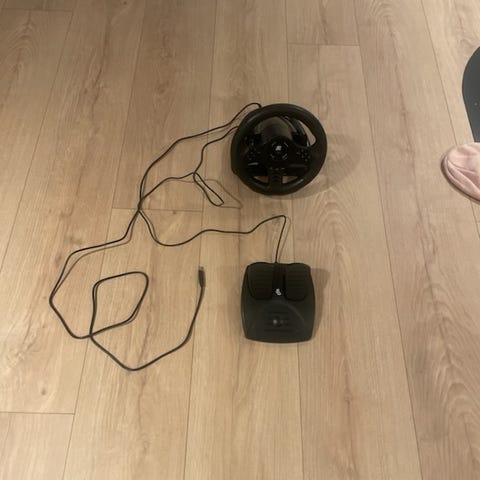 PlayStation 4 spillkonsoll med tre svarte kontrollere. Er pent brukt, men fortsatt mye liv i seg!