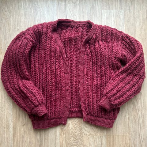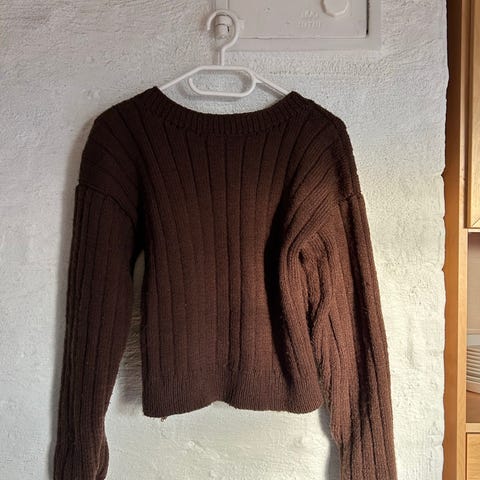 Hjemmestrikket genser med v-hals og splitt i sidene.