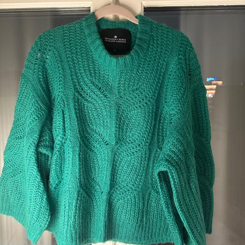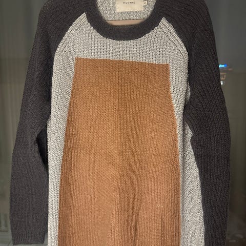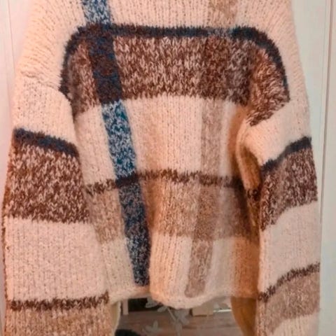 Just Female genser i størrelse M, laget av ull og alpakka. Genseren har et flerfarget mønster med nyanser av brun, oransje, hvit og blå. Veldig god og varm.