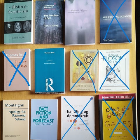 Selger pensumbøker fra første semester på årsstudium i filosofi. Bøkene ble kjøpt nye ved studiestart og er pent brukt, uten markeringer eller med svært få notater. Flere av bøkene er helt nye ikke åpnet engang.