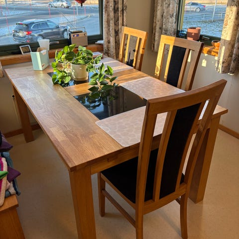 Hvis ønskelig selges og 6 pent brukte spisestoler i fargen mørkegrå og eik/trehvit.