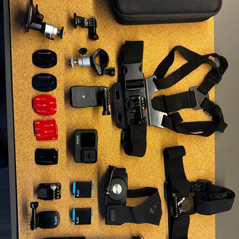 GoPro Hero. Kjøpt i 2014. Følger med en del tilbehør, inkludert flere festeanordninger, selfiestick/tripod og minnekort.
