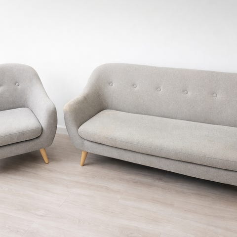 Grå 3-seters sofa, 2 lenestoler og ett hvitt salongbord. Selges som sett med matchende treben.