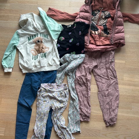 Str er 122-128. Lyse rosa skjørt har mindre str. Men ble brukt i perioden jenten brukte 122-128. 3 par strømpebukser nesten ubrukt. Grå skjørt sydd litt inn i midjen (var for stor)