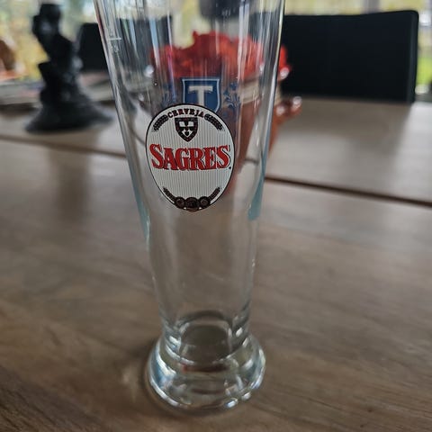 Tuborg Beer emblem / logo i ramme med en krone og noe trykt innrammet i isgrå farge i glasset. Gullfarget topp i glass. Ølglasset er ca 8 cm bred oppe, ca 18 cm lang og har en fot støpt i glasset nede så det står støtt.