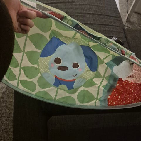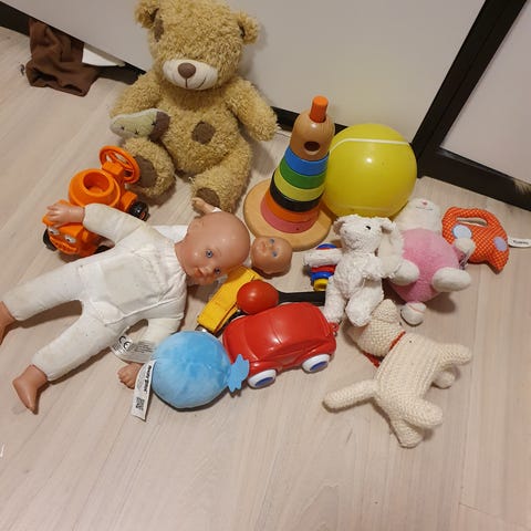 En haug med forskjellige babyleker gis bort mot henting. Reservert til fredag.