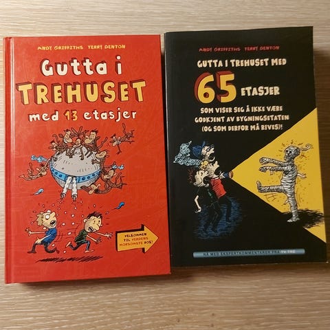 Gutta i Trehuset bokserie med flere bind. Serien inkluderer bøker med titler som 'Trehuset med 13 etasjer', 'Trehuset med 55 etasjer' og 'Trehuset med 26 etasjer'. Bøkene har fargerike omslag og er illustrert, egnet for barn og unge lesere.