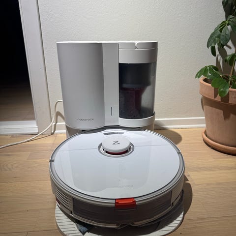 Roborock S7 robotstøvsuger i hvit farge. En automatisert rengjøringsenhet designet for effektiv støvsuging av gulvflater. Utstyrt med roterende børster og navigasjonssystem for optimal rengjøring.