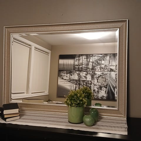 speil med enkel design. Speilet har en rektangulær form og reflekterer omgivelsene tydelig. Egnet for bruk i ulike rom for å øke romfølelse og lys. Ca 2m høyt. Solid ramme 10ish cm bred