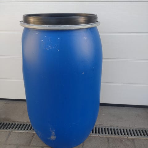 To blå metalltønner med en kapasitet på ca 200 liter hver.