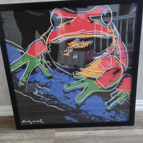 Maleri med landskapsmotiv i blått og gult, signert av kunstneren. Ramme i mørk farge med dekorative elementer. Passer til dekorasjon i hjem eller kontor.