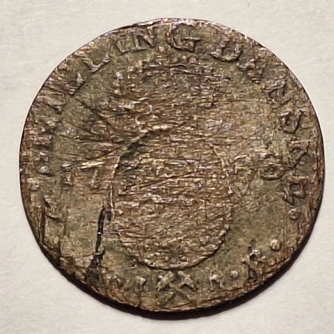 Mynten på bildet er en 2 skilling fra 1784, utgitt under Christian VII.
