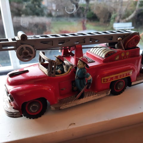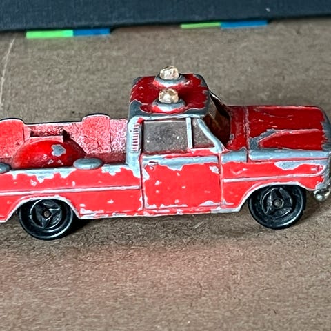 Rød lekebil laget i metall med merking som 'F.D.', 'Fire Chief' og brannsjefs-symboler. Modellen har detaljer som vinduer, hjul og interiør. Egnet som leketøy eller samlerobjekt.
