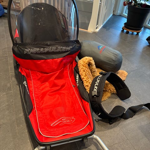 Selger Fjellpulken Classic, komplett med drag og sele. Pulken er i mer eller mindre strøken tilstand, uten feil, mangler, eller skader. Lite bruk til to barn.