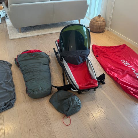 Fjellpulken komplett med sele og drag, og Voksi vognpose