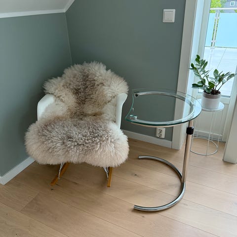 Rundt glassbord som kan justeres i høyden. Dette er ikke originalt.