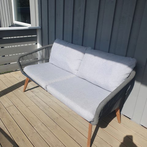 Sindig loungesofa med grå ramme i aluminium og sete- og ryggputer i tekstil. Sofaen har plass til tre personer og er egnet for utendørs bruk på terrasser eller hager.