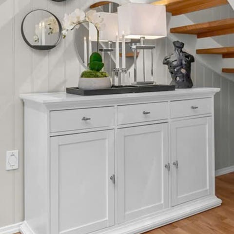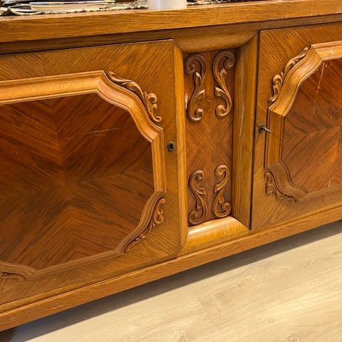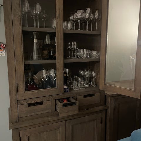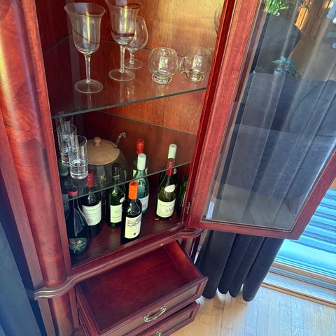 Vitrineskap og skjenk selges samlet for 5000kr, separat for 3000kr.