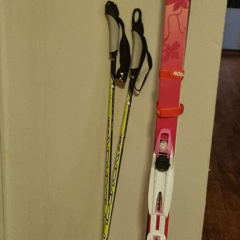 Blå barneski med tilhørende staver. Egnet for nybegynnere og barn som skal lære å stå på ski.