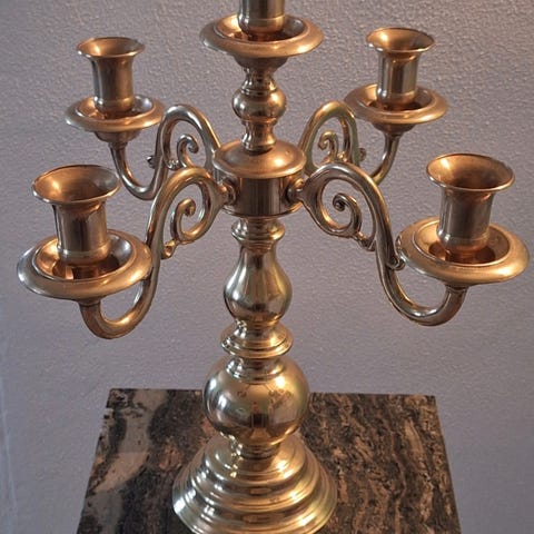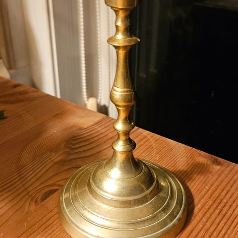 Eldre messingengler som fungerer som lysestaker i fosjellige størrelser.