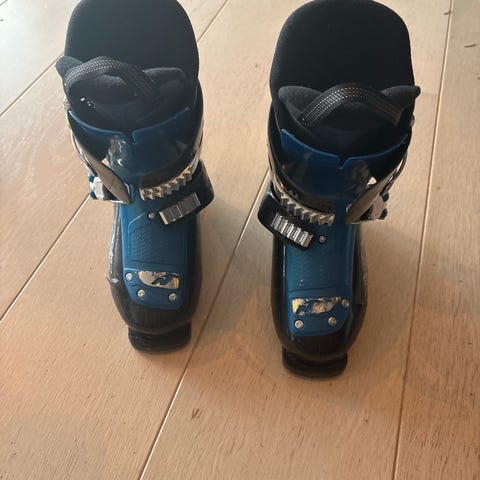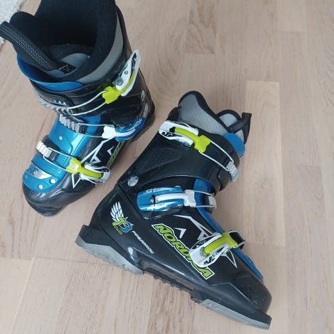 Nordica alpinski ski og 2 par støvler. Ski 118 cm. Støvler 27,3 og 29,6 cm. Finner ikke noen skostørrelse. Tror de er ca 35 til 37.