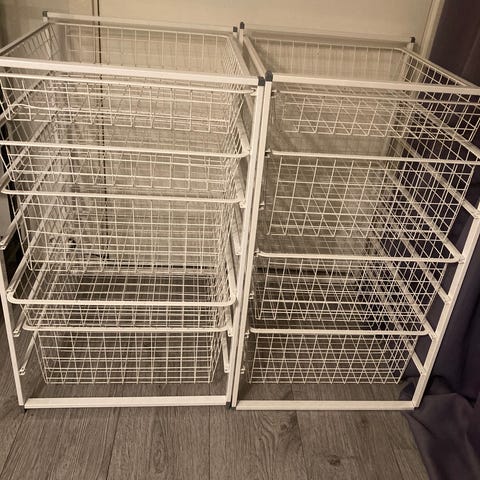 Elfa skuffeseksjon med 5 trådkurver selges. Noe overflatisk slitasje på rammen, ellers fin stand.