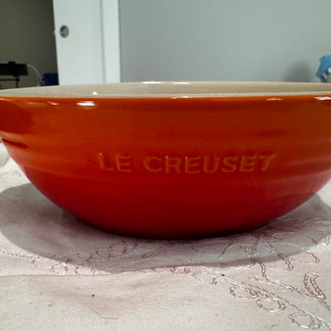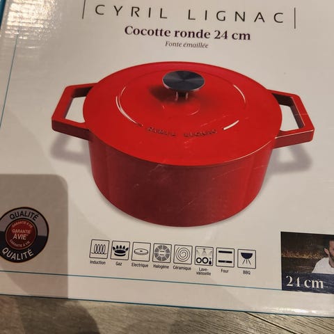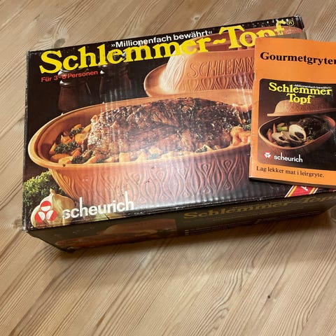 Selger en svart 3,4 l stor støpejernsgryte fra Christiania glasmagasin. Den er brukt to ganger og selges fordi jeg bruker den mye mindre enn tenkt. Den fremstår som helt ny, ingen synlige merker på at den har vært i bruk.