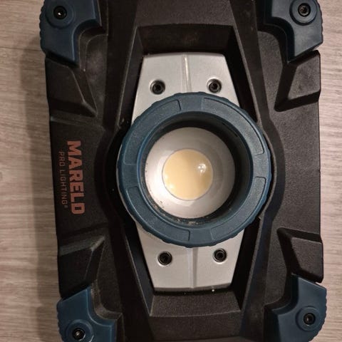 Den har ikke vært brukt på en stund. Den har stått der og samlet støv. Den fungerer som den skal. Litt støvete, men i god stand. Settet inkluderer lampen, strømforsyning med kabel og en magnetisk sokkel fra en annen lampe, men den kan også brukes med denne.